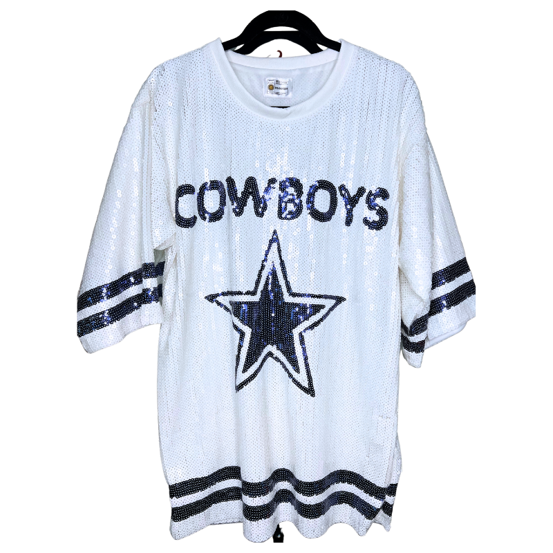 Cheer on your favorite team in style with the *PRE ORDER* SEQUIN COWBOY DRESS!!!! A one size oversized dress crafted with sparkling sequins and designed for game day, this dress will have you looking fabulous as you show off your team spirit. Place your pre order today and be the best-dressed fan in the stands!