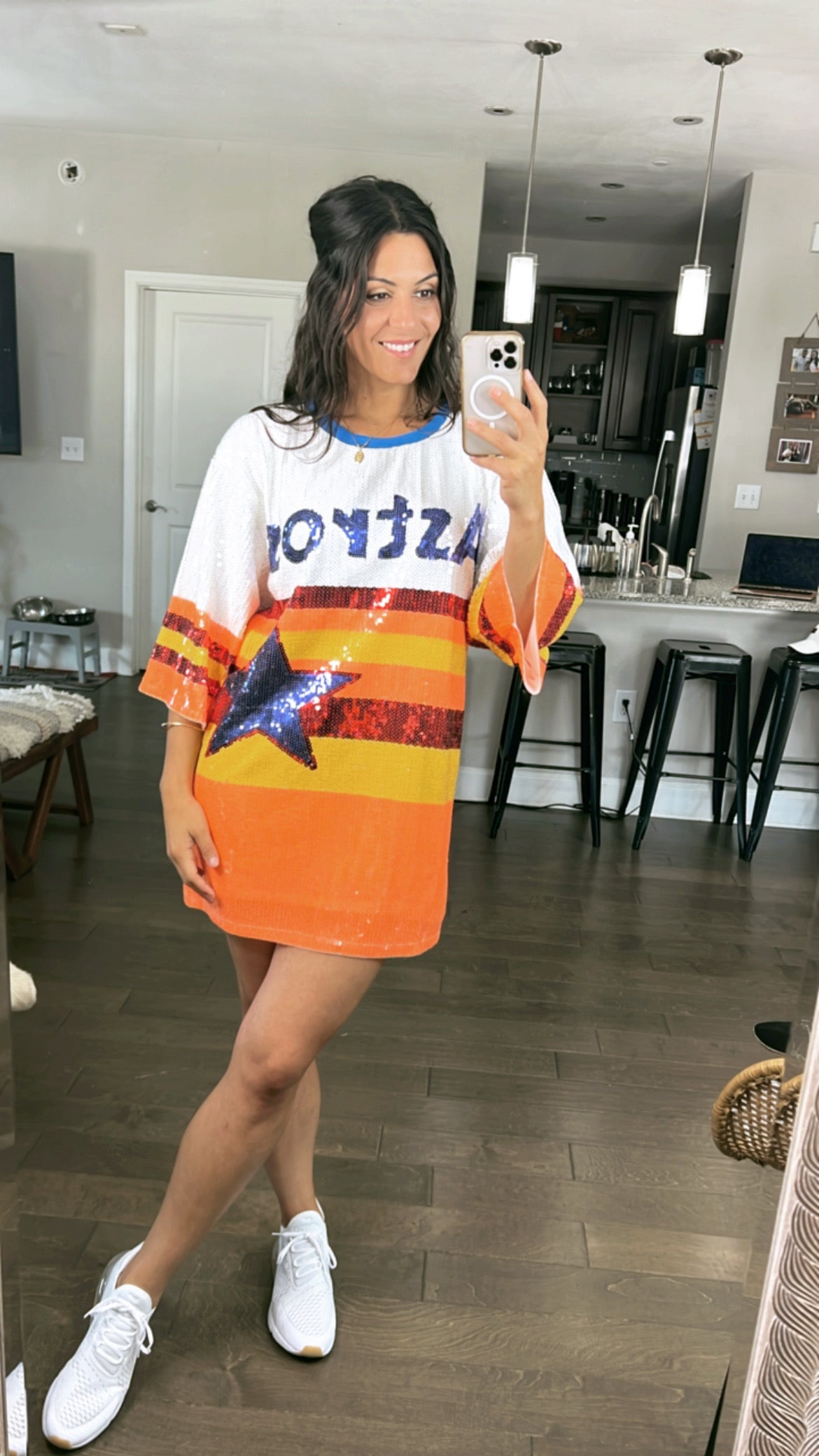 Cheer on your favorite team in style with the SEQUIN ASTRO DRESS!!!! A one size oversized dress crafted with sparkling sequins and designed for game day, this dress will have you looking fabulous as you show off your team spirit. Place your pre order today and be the best-dressed fan in the stands!